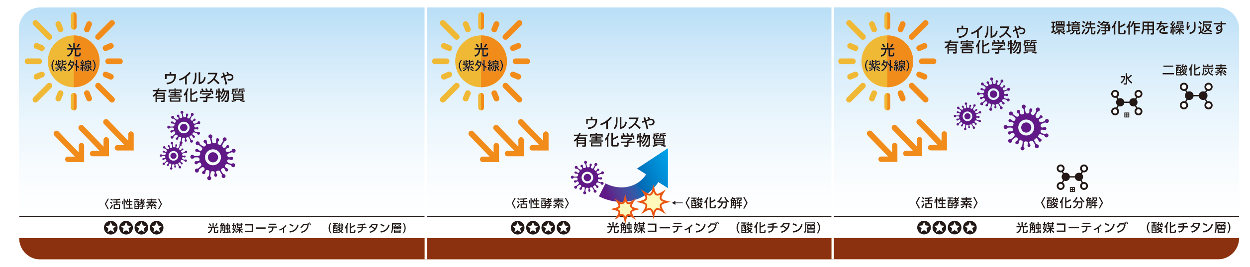 パーフェクトクリーンコートは、光触媒と金属イオンのハイブリッドタイプのものとなり、光触媒が、光を受けることで次の効果が期待できます。