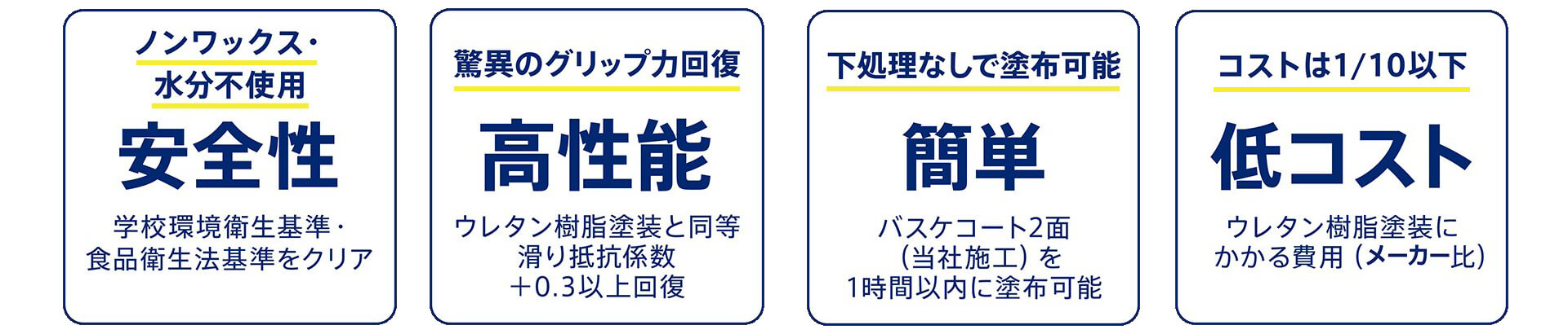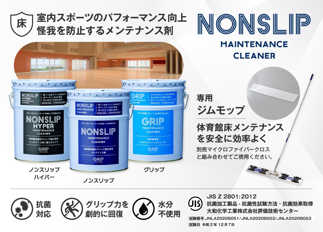 高度な技術や特殊な機器などを必要せず、施設利用者さまの手で、体育館のフロアメンテナンスが可能になるのです。学校環境衛生基準に適合。衛生面、管理面でも安心安全にご利用いただけます。今後、NONSLIPが全国の体育館をはじめ、幼稚園、学校、老人介護施設など、多くの施設の床で利用され、床の滑りやすさから引き起こされる事故や怪我を少しでも解消し、安心して施設をご利用いただけるようにサポートさせていただきます。